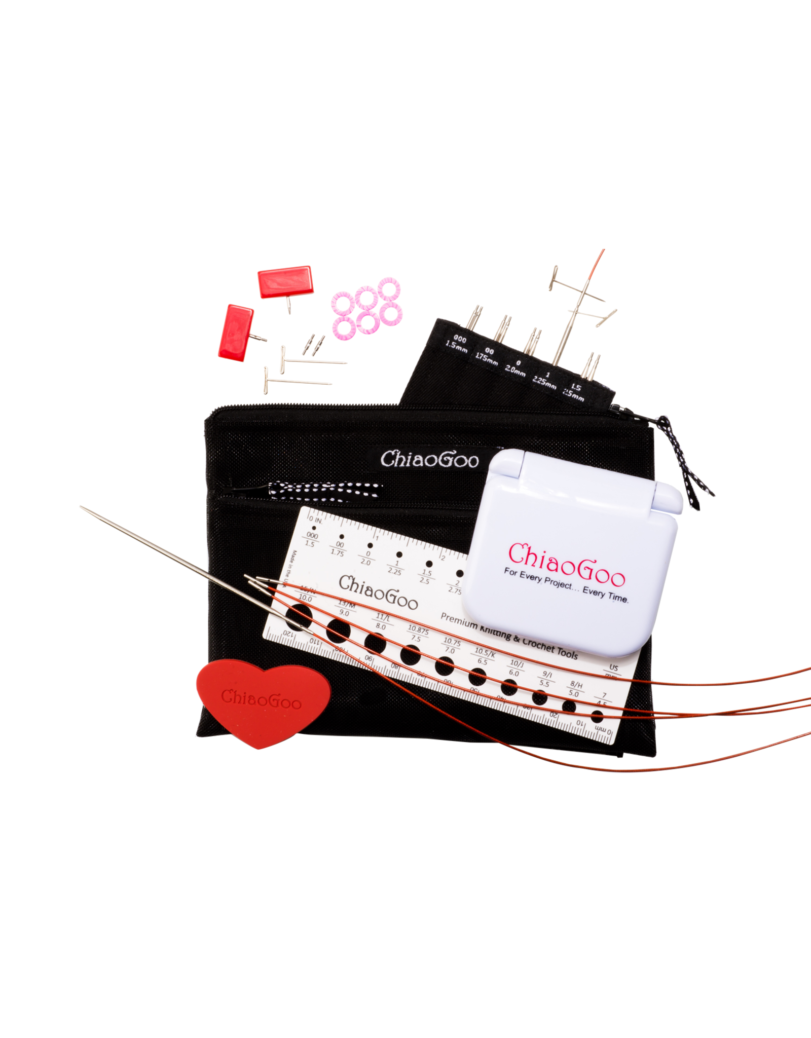 - Tools Kit (Includes 2 cable connectors, 2 end stoppers, 4 tightening keys, 6 stitch markers & a heart shaped rubber gripper)
